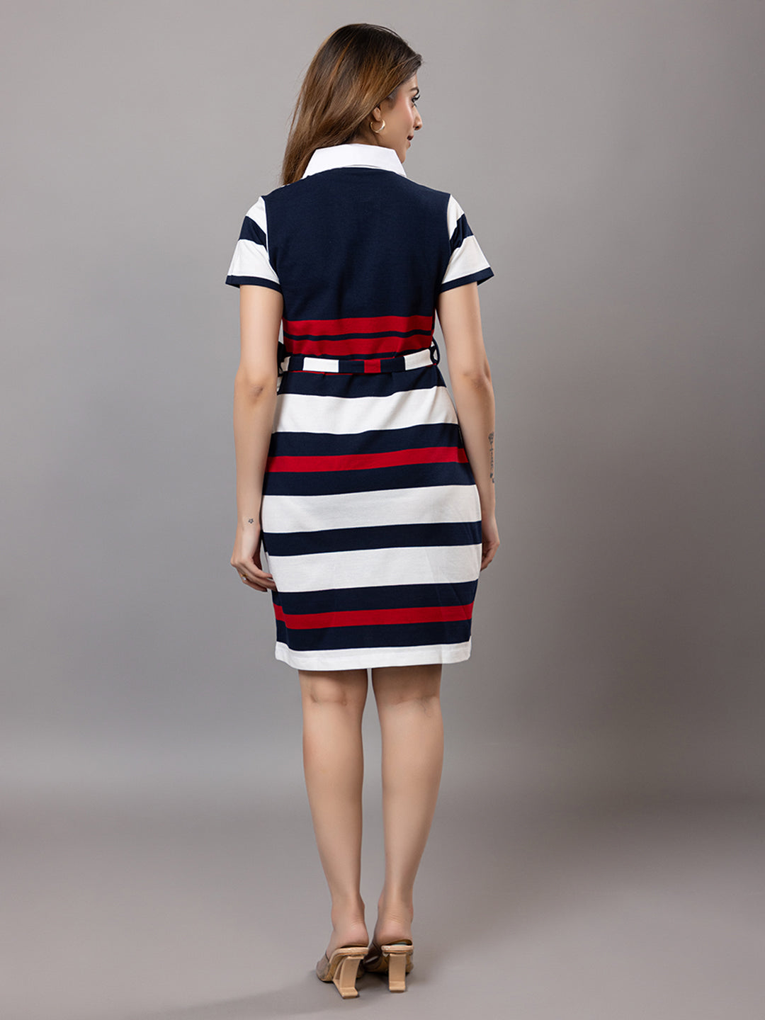 ARISH Striped Polo Tunic Dress, Short Sleeve with Side-Tie Belt, Knee Length, Navy Blue White Red