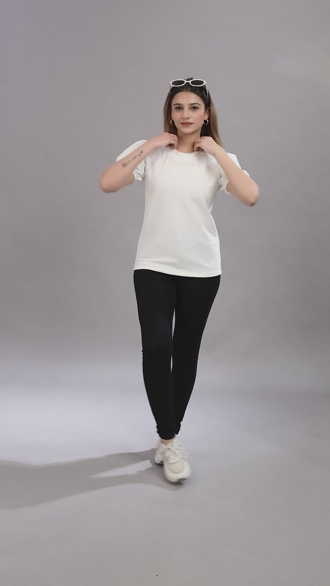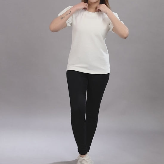 ARISH Women's Puff Sleeve Top, White Textured Knit, Crew Neck, Short Sleeves